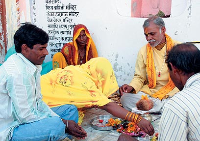 תמונה זו לא צולמה במקדש או פסטיבל דתי. היא צולמה ממש מחוץ למרכז קניות ובו חנויות מחשבים ואופנה. עוד עדות לניגודים והקונפליקטים המדהימים העוברים על הודו, הנעה בין רוחניות ודת, לבין תרבות הקפיטליזם הדורסנית.