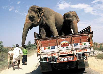 פילים מובלים במשאית. צולם באזור נידח במדינת אנדרה פרדש שבדרום הודו. בצילום לא רואים איך מתנדנדת המשאית מצד לצד ונראית כאילו היא עומדת להתהפך בכל רגע. וזה מסוג המחזות שניתן לראות רק בהודו.