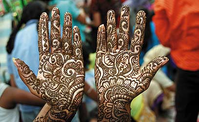 חינה בבזאר המרכזי בפהרגאנג', דלהי. שמו של החתן המיועד, סוניל, משולב בין העיטורים