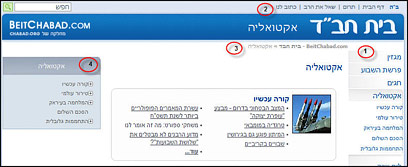 דף הבית של האתר מקדם את פני בתחושה קלסטרופובית, הרבה מידע דחוס במסך אחד. בחלקו המרכזי של הדף מוצגים ברצף שלושה "סיפורים חמים" כשלצידם ציטטה, ואלו תופסים את מרבית השטח המרכזי. מתחתם מופיעים בשני טורים סיפורים מתחלפים. בצידו השמאלי של דף הבית מופיעות ארבע קוביות מידע (אשר ילוו אותנו תמידית) להן הוקצה שטח גדול יחסית. תוכן שפונה לקהל החילוני, כגון: איתור בית חב"ד בעולם, בירור זמני הדלקת נרות, נמצא בחלקו המרכזי של העמוד, אך מצריך גלילה של מסך אחד מטה.