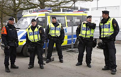 שוטרים מחוסרי עבודה מחוץ לבאלטיק הול במאלמו (רויטרס)