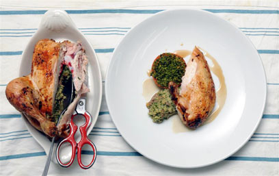 - מתבלים את העוף מבפנים ומבחוץ במלח ובפלפל, ממלאים בתערובת פירורי הלחם וקושרים.