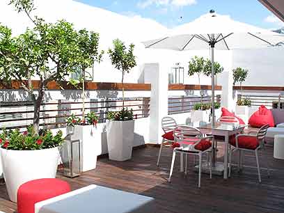 בקומת הגג נבנה דק עץ, שיהווה בית קפה ובר, בית קפה נוסף יפעל בחצר האחורית של המלון. חבל רק שהנוף הניבט מחלונות המלון ומגגו הוא נוף תלאביבי דהוי ומרופט, ללא פיסת ים. מצד שני, הים נמצא בהישג רגל, ובן-יהודה שטראסה הייקי עדיין אותנטי.