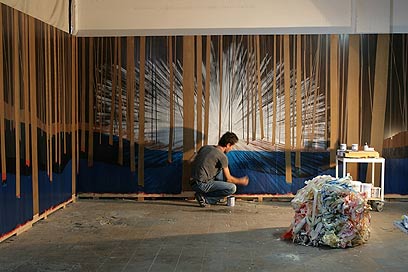 "אחרי שהצגתי את הסקיצות בפני האוצרים, הועברו לסטודיו שלי לוחות MDF גדולים, עליהם עבדתי בחצי השנה האחרונה, בעוד המלון נבנה," מספר האמן אולף קונמן, המאכלס את הקומה הרביעית. "במקביל, צילמתי את תהליך העבודה, ובכל חדר יהיה צילום אחד שמתאר שלב בעבודה הנמצאת במסדרון."