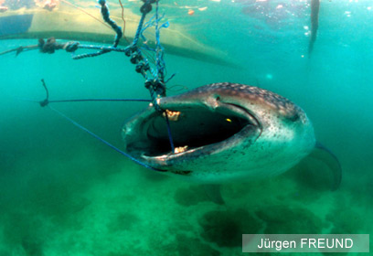כריש הלוויתן והחבל שנקשר לזנבו (צילום: WWF-Philippines)