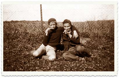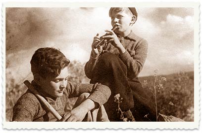 2. משה יעקבסון (עם כובע) כחניך בשפיה, עם חבר, מנגנים במפוחיות פה, 1935.