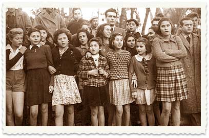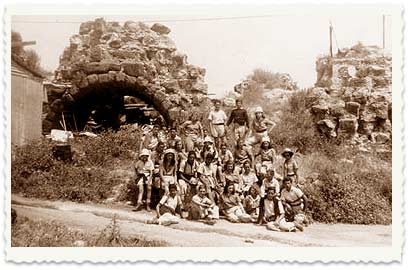 14. המקהלה בטקס נטיעות ט"ו בשבט: 1 - דינה ליטרט, 2 - רותי פולק, 3 - דבורה אלבוים, 4 - חוה שצרנסקי, 5 - עליזה נבל, 6 - דרורה ארקין, 7 - יהודית זינגר גנון, 8 - יוסף דשבסקי, מנהל הכפר.