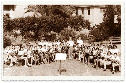 13. התזמורת בגן המרכזי, 1943: 1 - משה יעקבסון, 2 - דינה ליטרט (מנגנת על גיטרה עם שני ראשים), 3 - דרורה ארקין, 4 - ישראל (זינגר) זמיר (בנו של הסופר האידי בשביס זינגר), 5 - יפרח ליזרוביץ (בקיץ 1938 כנופיית רוצחים ערבים בהנהגת אבו-דורה חטפה את משפחתו של קצין משטרת עתלית היהודי ליזרוביץ, רצחה את הבוגרים ושחררה את שלושת הילדים. הילדים הגיעו בלילה לגדר קיבוץ משמר העמק. השומר הנרי קלאוזנר שלא ידע עברית טוב גירשם בתחילה עד שהבין במה מדובר. הילדים אומצו בקיבוץ, ויפרח למד בשפיה).