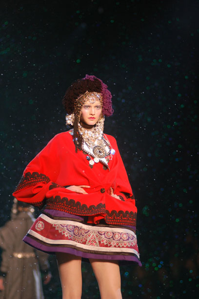 בתצוגה של גליאנו התפאורה היתה תאורת לייזר חדשנית אבל הדגמים הנפלאים עוצבו דווקא ברוח מסורתית, בהשראת תלבושות מהבלקן. ביניהן ראינו חולצות רקומות עם שרוולים רחבים, חצאיות גדולות ורקומות, תכשיטים ענקיים, כובעים עשויים מטבעות ונעליים ומגפיים עם פונפונים.