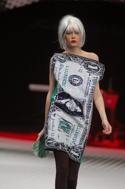 ז'אן שארל דה-קסטלבז'אק נוהג לשלב בתצוגות המשעשעות שהוא עורך שמלות מצוירות. הפעם אהבתי במיוחד שמלה עם שטר של דולר אמריקאי שעליו פורטרט של הנשיא החדש ברק אובמה. בסוף התצוגה פיזרו הדוגמניות "דולרי אובמה" עם סימני נשיקה שנוצרו לכאורה על ידי מישל.