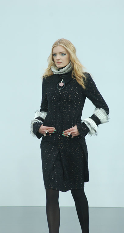 שמלות קצרות ומעט חליפות בלטו בתצוגה שעיצב קרל לגרפלד לשאנל. שחור ולבן היו הצבעים הבולטים אך פה ושם נראו גם ורוד וירוק. בין האבזרים בלטו כמה המצאות חדשות של המעצב, למשל קישוטי שרוול מבד דנטל לבן או קישוטים בצורת פרח הקמליה שאפשר להעביר מבגד לבגד, ברוח הזמן והצורך בחיסכון. עוד ראינו שם כובעי צמר בסגנון כובעי קש של מלחים וגם תיק גב בצורה של ילקוט בית ספר.