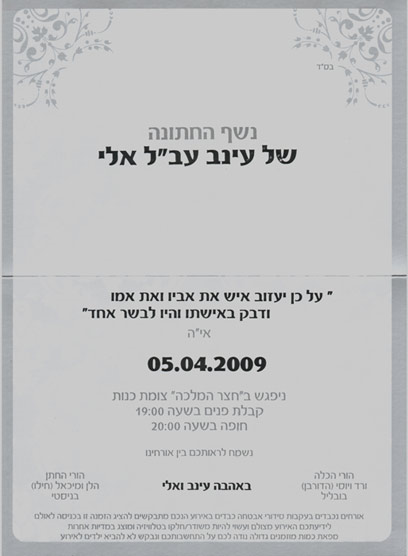 ההזמנה הכסופה, איתה חייבים להצטייד כדי להיכנס לאולם הממוקם בצומת כנות, כוללת ציטוט מספר בראשית על עזיבת קן ההורים והקמת בית חדש בישראל. בין השאר מיודעים האורחים על "סידורי אבטחה כבדים", וכי האירוע יצולם לסדרת הטלוויזיה אודות בני המשפחה. בקשה מיוחדת בחתימת הדורבן מהמתייצבים: להימנע מהבאת ילדים, כדי שלא לחרוג מכמות מוזמנים גדולה. המדור ממליץ לזוג הצעיר ללמוד ממיכל ינאי, איך חוסכים בעלויות.