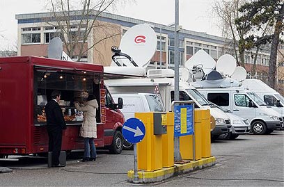 ניידות שידור מחוץ לאולם בית המשפט בסנקט פלטן (צילום: AP)