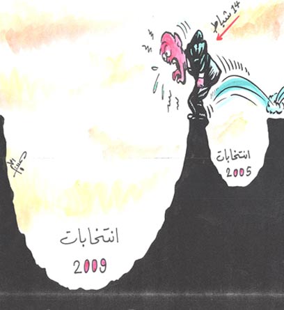 בחירות 2009 בלבנון בעיני חיזבאללה: המחנה האנטי-סורי היריב מוצג כמי שיתקשה לקפוץ הפעם מעל לתהום, בניגוד לבחירות הקודמות ב- 2005 (מתוך אתר "אל-מנאר" של חיזבאללה)