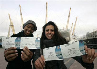 מעריצים עם כרטיסים למופע של מייקל ג'קסון בלונדון (צילום: איי פי)