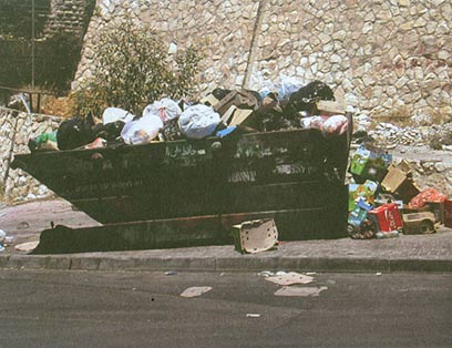 עוד מצא המבקר כי מערך פינוי האשפה אינו מאורגן על-פי תכנון מוקדם, ומשום כך אינו פועל באופן מיטבי. לדברי המבקר, בכל מיני מקומות בעיר מכלי האשפה עולים לעתים על גדותיהם, והאשפה העודפת מתפזרת סביבם. עוד נמצא בביקורת, כי המצב חמור בעיקר בעיר העתיקה, בשכונות מזרח ירושלים ובחלק משכונות מרכז העיר. בשכונות שבמזרח ירושלים יש מחסור במכלי אשפה, ובמקומות רבים האשפה מצטברת על המדרכות. ברוב חלקי העיר העתיקה אין מכלי אשפה, והאשפה נערמת בסמטאות.