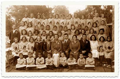 4. תמונה קבוצתית במעון עליזה: A - חוה (הוז) בורודובסקי, B - אישה יוסף ברודובסקי, מנהלי המעון, F - שרה ציזלינג (אשת אהרון ציזלינג), E - רחל (מברזיל).