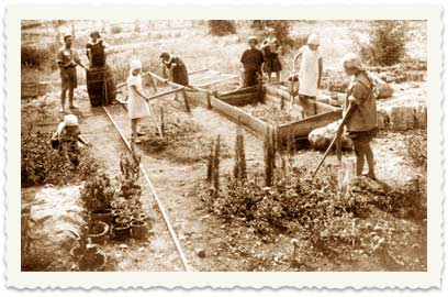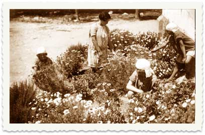 1. בחצר מעון עליזה שבירושלים, 1921: 1 - חוה (הוז) בורודובסקי, מנהלת המעון, 2 - עדה, בתה של חוה שגדלה בשנותיה הראשונות עם היתומים, 3 - יונה זיסלמן, מטפלת במעון.
