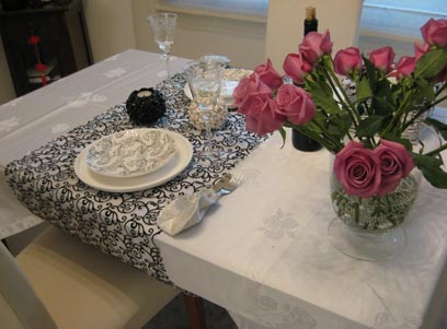 במקרה זה השולחן אמנם זוגי, אך ניתן ליישם את הרעיונות לשולחן ארוך. בסידור שולחן זה יש שימוש במוטיבים בצבעי שחור ולבן, כאשר הפרחים הם אלה שמספקים את הצבע. יש כאן שימוש בראנר שפרוש דווקא לרוחב בשולחן ולא לאורכו, ומקשר בין 2 הצלחות שנמצאות זו מול זו. הכלים לנרות שנמצאים בין הצלחות נמוכים, על מנת לא להסתיר את הסועדים זה מזה, וסידור הפרחים הגבוה מונח בצד השולחן. על הראנר, הצלחות וגביעי היין מופיע מוטיב זהה מסולסל אשר מקשר ביניהם. הסכו"ם נמצא בתוך שקיק בד שניתן להשיג בחנויות למוצרים חד פעמיים.