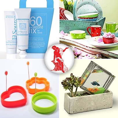 כלים מבית העיצוב RUGINE רחוב מונטיפיורי ת"א; ערכת טיפוח לידיים קרבטרי & אוולין 109.90שקל; אקוואריום מיניאטורי - להשיג בסטודיו אנד ג'וי (שיקום אנשים עם צרכים מיוחדים) 269 שקל; טבעות לביצה (פרח, טבעת ולב) להשיג ברשת "דה קוק סטור" - 19.90 שקל