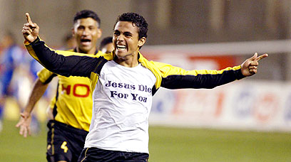 גרפיטה חוגג אחד מ-20 שעריו. העריץ בילדותו את ראי (צילום: AP)