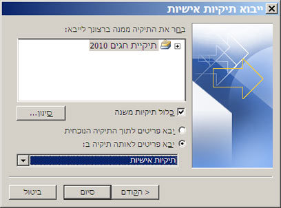 ה. בחלון הבא תוכלו להגדיר מה ולאן לייבא; תוכלו פשוט להשתמש בברירות המחדל: הקליקו על סיום.