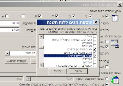 כדי להפעיל את תצוגת החגים באופן רגיל, עליכם להיכנס לכלים, אפשרויות ואז אפשרויות לוח שנה. בחלון שנפתח הקליקו על הוספת חגים, סמנו את החגים הרלוונטיים והקליקו על אישור.