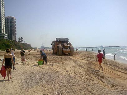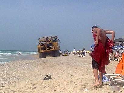בתחילה עבר בין המבלים בחוף דחפור גדול שנסע על פס המים, כשעגלה רתומה אליו. "זה לא היה נעים לראות שופל כזה גדול שמסתובב בחוף בין המבלים והמתרחצים", אמר ל-ynet בועז קפנר, שבילה על החוף עם חברו וצילם את המפגע הבטיחותי. "באותו הזמן היה החוף הומה אדם, משפחות וילדים. אמנם לא כמו בחודשים יולי-אוגוסט, אבל הגיעו הרבה לחוף כי חג ואנשים בחופש. הדחפור שעבר במקום היה דומה לדחפור שביצע את הפיגוע בירושלים".