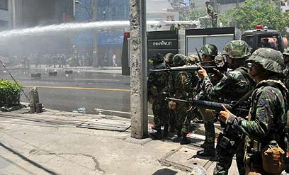 חיילים חמושים מתיזים מים על מפגינים בבנגקוק (צילום: AFP)