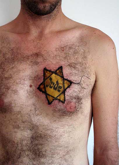 באותה קומה מתנוסס צילום פלג גופו העליון של ישראלי, ענוד בטלאי צהוב שתפר לגופו בחוט ומחט. כבר בצילום הזה רומז ישראלי כי הוא לא רק משייך את עצמו לזהות יהודית, כפי שנראה במבט ראשון, אלא בוחר בטלאי כמשהו שמסמן אותו כנגוע, כמסומן, (מעניין בהקשר הזה לחשוב על סרטו של עמוס גוטמן "נגוע").