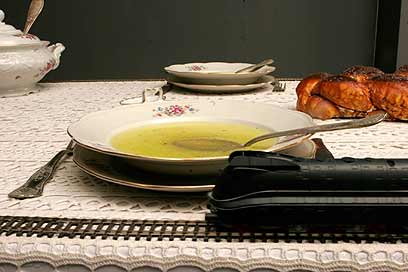 עוד על השולחן מונחות קערות מרק עם נוזל צהוב יצוק וחלה. הקפאת הנוזל הצהבהב בלוויית כותרת התערוכה מספקים רמז עבה לכך שמדובר בסעודת ערב שבת, ובשולחן שיושביו נטשו בחופזה, כנראה עקב פוגרום או גירוש למחנות.