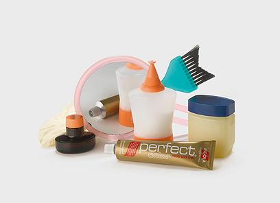 הערכה המלאה לצביעת שיער. מימין: וזלין למניעת הכתמת העור, מברשת למריחת הצבע על השיער, קרם צבע, מי חמצן, מראה, בקבוק לערבוב, כפפות (צילום: קית' גלסמן)