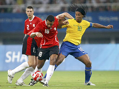מוסה דמבלה במדי בלגיה עם רונאלדיניו בבייג'ינג (צילום: רויטרס)