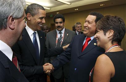 השניים, המשתתפים בוועידה הנערכת בטרינידד, נקלטו בעדשת המצלמה כשהם לוחצים ידיים ומחייכים זה אל זה בחמימות. ממשלת ונצואלה מיהרה לפרסם את התמונה, בה מניח נשיא ארצות הברית את ידו בידידות על כתפו של צ'אבס.