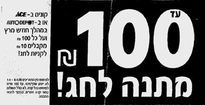 ערב חג הפסח יצאה רשת אייס קנה ובנה במבצע: "קונים ב-ACE או ב-AUTODEPOT במהלך חודש מרץ ועל כל מאה ש"ח מקבלים 10 ש"ח לקניות לחג!" כל זה, באותיות בגודל סביר, על יד המספר 100 ש"ח - באותיות ענק - כשבתוך האפס השני של המספר מופיעה באות קטנה יותר המלה "עד", ומתחתיו מופיע - גם כן באותיות בולטות - "מתנה לחג!"