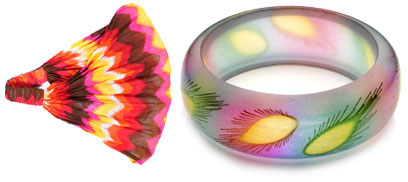 מימין: צמיד זוהר עם ציורי נוצות טווס (אקססוריז, 45 שקל), מטפחת ראש צבעונית (H&O, 15 שקל). צילומים: טל טרי, אבי ולדמן