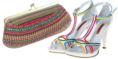 מימין: נעלי עקב עם רצועות עור צבעוניות (נעלי מרקו, 800 שקל), תיק קלאץ' משובץ חרוזים צבעוניים (אקססוריז, 210 שקל). צילום: אבי ולדמן