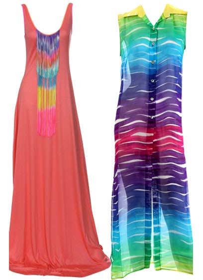 מימין: בגד חוף ארוך בצבעי ניאון (גוטקס, 999 שקל), שמלת מקסי מכותנה יפנית ומשי עם פרנזים צבעוניים (יוסף, 2,000 שקל). צילומים: אבי ולדמן, ניר יפה