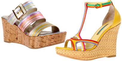 מימין: סנדל פלטפורמה עם עקב קש קלוע ורצועות עור צהובות (נעלי מרקו, 800 שקל), סנדל פלטפורמה בשלוב סוליית שעם ורצועות עור צבעוניות (דיסקו רוסו, 480 שקל). צילום: אבי ולדמן