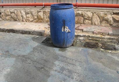 זיהום מים? חבית חומר מסוכן ליד מערכת הניקוז העירוני