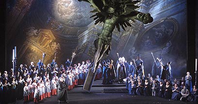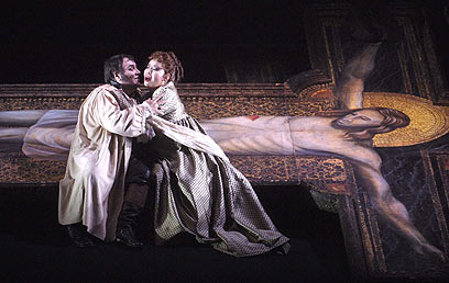 הייחוד בהפקה שעלתה אמש במשכן לאמנויות בתל-אביב הוא השימוש בסרטי וידאו תלת-מימדיים, כמשלימים, אולי כמחליפים, לתפאורה המסורתית. הבמאי והמעצב, הארגנטינאי-איטלקי הוגו דה אנה, צילם סרטי וידאו רב-כיווניים בשלושת האתרים שבהם מתרחשת העלילה (כנסייה, משרדו-ארמונו של מפקד המשטרה, מבצר הכלא).