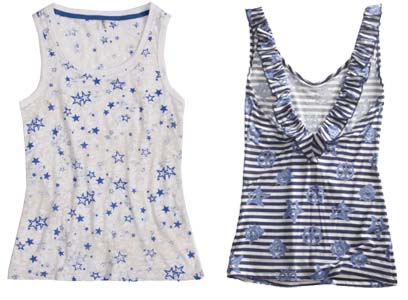 מימין: גופיה בהדפס עוגנים וכוכבי ים (קסטרו, 89.90 שקל); גופיית כותנה בהדפס כוכבים (גולף, 69.90 שקל). צילומים: רן גולני, ניר יפה