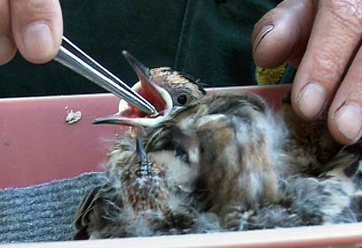בימים הראשונים, מטלון והמטפלים בבית החולים היו צריכים לפתוח את המקור של הגוזלים כדי להכניס את המזון פנימה.