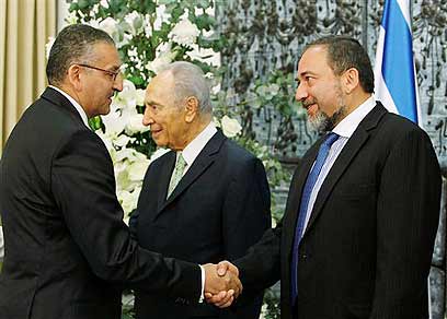 ליברמן ושגריר מצרים, יאסר רידא, לוחצים ידיים בבית הנשיא (צילום: AP)