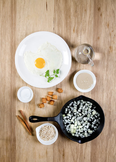 טחינה במקום שמנת במרק, מי ורדים ומקלות קינמון במקום סוכר בתה, חלבון במקום חלמון בחביתה, סודה לשתייה במקום סוכר ברוטב העגבניות, קרוטונים תוצרת בית, שיבולת שועל במקום פירורי לחם, בצל מטוגן נושלים של עצמו (צילום: יוסי סליס)