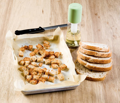 למה להחליף? מנת קרוטונים תעשייתיים (כ־20 גרם) מכילה 112 קלוריות ו־6.5 גרם שומן, ששליש מתוכו הוא שומן רווי. הקרוטונים גם עשויים מקמח לבן שלא תורם לגוף דבר פרט לקלוריות ולא פחות מ־200 גרם נתרן. לעומת זאת, פרוסת לחם מדגן מלא מכילה 75 קלוריות בלבד, רובן מפחמימות מורכבות המאריכות את זמן השובע, שפע סיבים, מינרלים וויטמינים ממשפחת B, ואפס נתרן (עודף נתרן בגוף עלול לגרום לעלייה בלחץ הדם). ארבע התזות של ספריי שמן יוסיפו רק 10 קלוריות.