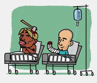 בחדר המיון היו מדממים שתויים אחרים, אבל מהר מאוד התברר שאני היחיד שחתך את עצמו: בשעתיים שביליתי שם פגשתי חמישה פצועי דקירה ונער אחד ששברו לו בקבוק בירה על הראש במהלך מסיבת גיוס. פשוט מדהים, חשבתי, איזה סיפורים אפשר למצוא בחדר מיון באמצע הלילה של יום שישי. חבל שאין פה עיתונאי.