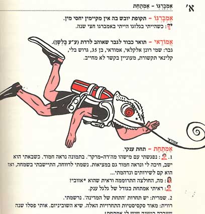 "כל מילה שהזיזה לי משהו או פונטית, או אסוציאטיבית, שהדליקה לי את הדמיון באיזשהו אופן, זכתה מיד להגדרה חדשה. המילה אבוקדו, למשל, היתה הראשונה. מה זה אבוקדו? גירדתי בקודקודי, כמובן! ידעתי אחרי חמש שניות - זהו מחזר רכרוכי ממוצא דרום אמריקני. ואז הגיע גם משפט הדוגמה: 'האבוקדו לא מפסיק להתקשר! רוצה שנרקוד סלסה! איך הוא נמרח עלי כל הזמן'".