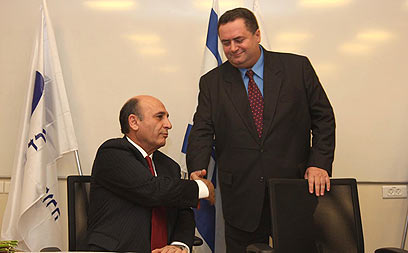 מימין: שר התחבורה החדש, ישראל כץ, וקודמו, שאול מופז (צילום: גיל יוחנן)