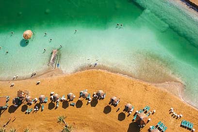 במקום הכי נמוך בעולם. שמשיות, כסאות נוח ורוחצים באחד מחופי ים המלח, על רקע קשת הגוונים הירוקים של המים.